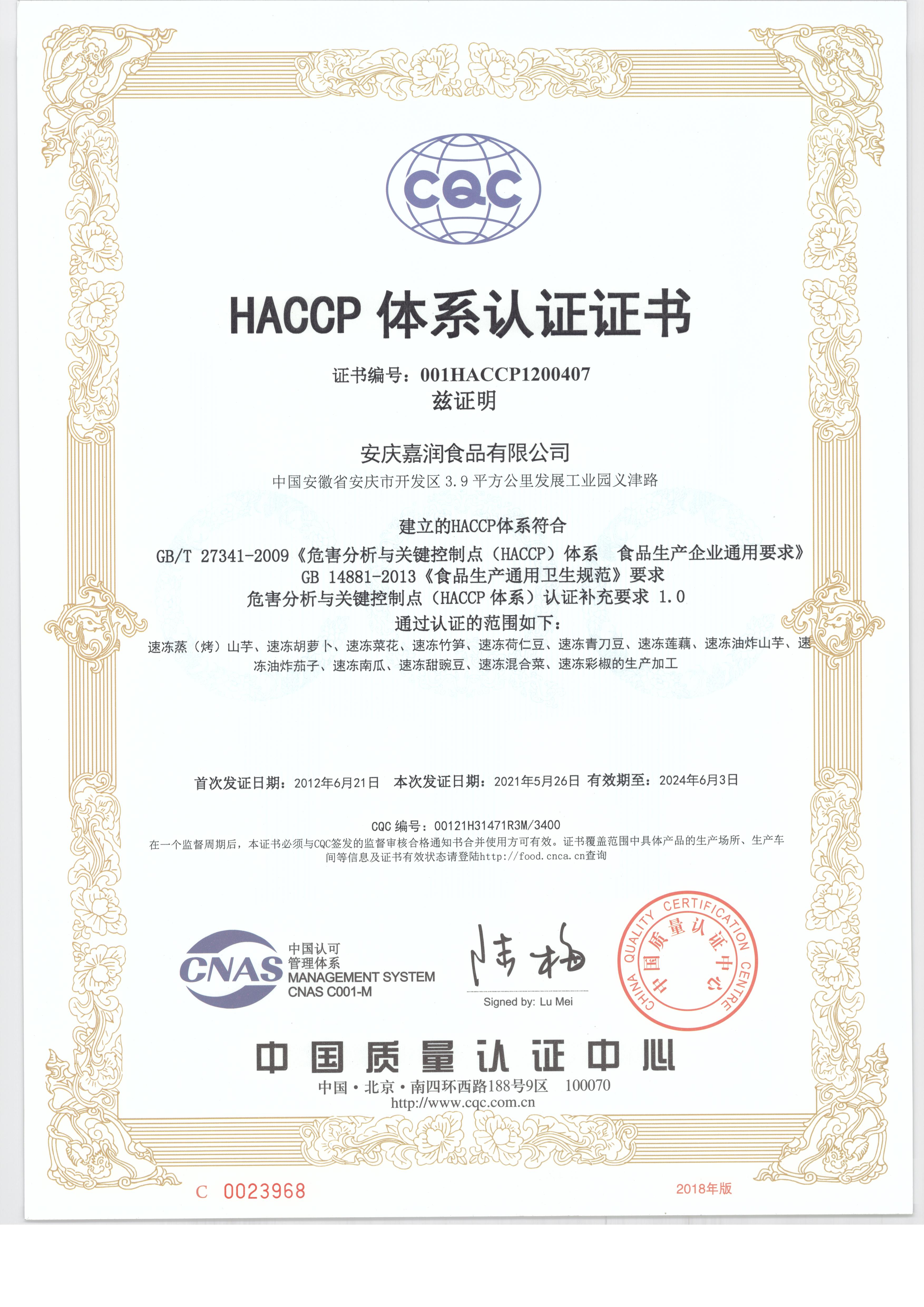 公司先后通過了HACCP、ISO9001質(zhì)量管理體系認(rèn)證和ISO22000食品安全管理體系認(rèn)證,同時企業(yè)通過了安全生產(chǎn)標(biāo)準(zhǔn)化三級認(rèn)證。公司憑借優(yōu)良的產(chǎn)品質(zhì)量和誠信經(jīng)營贏得了良好的社會口碑,先后榮獲安慶市農(nóng)業(yè)龍頭企業(yè)、安慶市質(zhì)量管理獎、中國質(zhì)量誠信企業(yè)、A級納稅信用單位、金融守信企業(yè)等榮譽稱號。