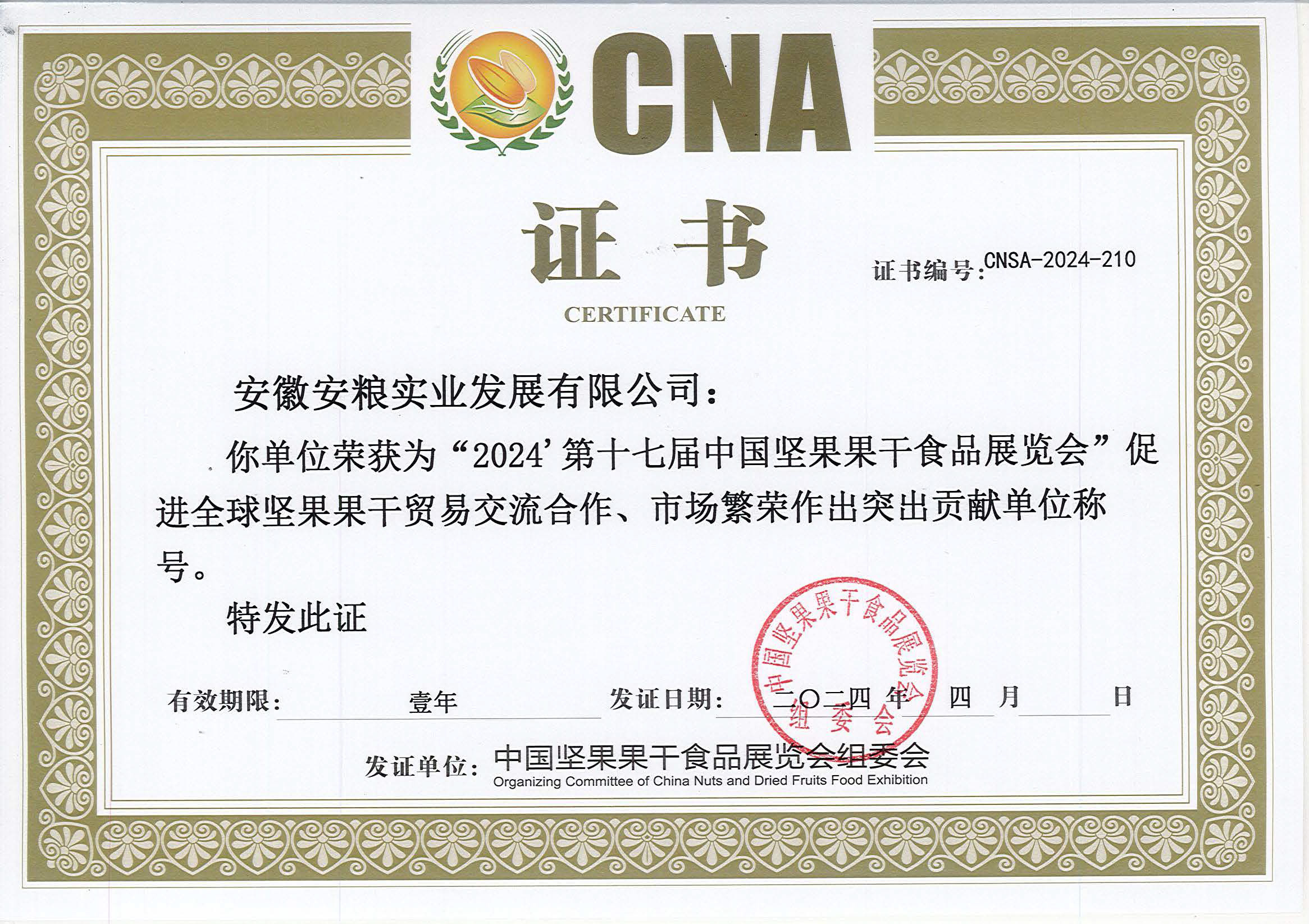 安糧實(shí)業(yè)在此次展會(huì)上還榮獲了“2024年第十七屆中國(guó)堅(jiān)果果干食品展覽會(huì)促進(jìn)全球堅(jiān)果果干貿(mào)易交流合作、市場(chǎng)繁榮作出突出貢獻(xiàn)單位”稱號(hào)。這一殊榮不僅是對(duì)安糧實(shí)業(yè)經(jīng)營(yíng)實(shí)力的有力證明,更是對(duì)公司在行業(yè)內(nèi)卓越貢獻(xiàn)的認(rèn)可。未來,安糧實(shí)業(yè)將以此為動(dòng)力,與合作伙伴深耕市場(chǎng),實(shí)現(xiàn)共同發(fā)展,繼續(xù)在行業(yè)內(nèi)書寫更加輝煌的篇章。