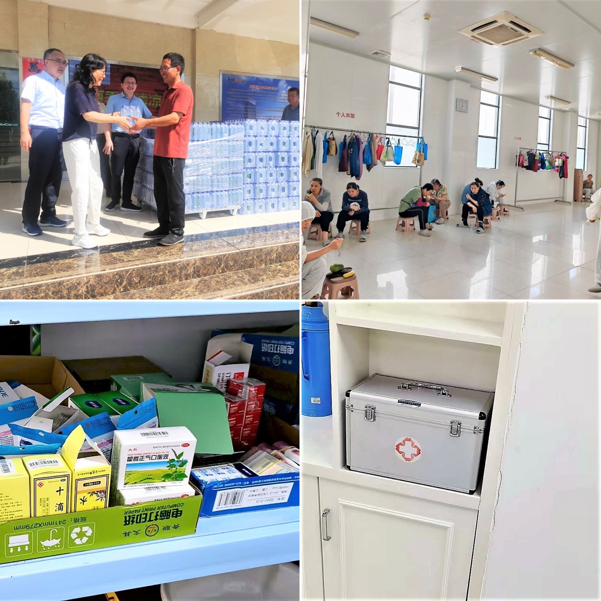 防暑降溫,守護(hù)員工健康:各工廠高度重視員工的防暑降溫工作,為員工撐起“健康保護(hù)傘”。工廠在車間內(nèi)配備了風(fēng)扇、空調(diào)等降溫設(shè)備,確保工作環(huán)境溫度適宜。同時(shí),為員工提供防暑藥品,以及礦泉水等物資消暑解渴。此外,工廠合理調(diào)整員工的工作時(shí)間,采取輪班制、縮短連續(xù)工作時(shí)間等方式,讓員工在高溫環(huán)境下也能得到充分的休息,避免中暑等情況的發(fā)生。巢湖嘉誼還在車間設(shè)置了專門的空調(diào)休息區(qū),方便員工在工間休息放松。