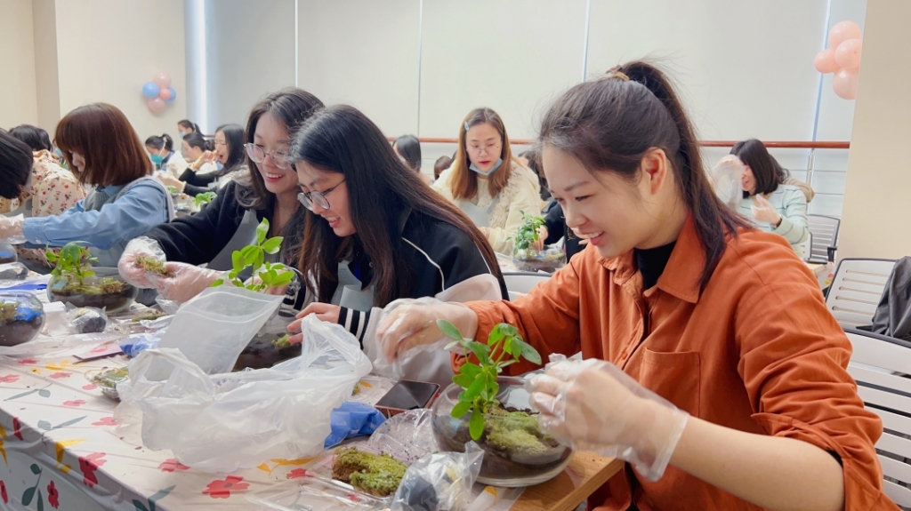 微景觀是將苔蘚、多肉等植物配以砂石、泥土、玩偶裝進(jìn)容器,構(gòu)成妙趣橫生的微觀世界,一個(gè)微景觀本質(zhì)上也是一個(gè)小型生態(tài)系統(tǒng)。女職工們在老師的指導(dǎo)下開始微景觀DIY活動,大家認(rèn)真構(gòu)思造型,充分發(fā)揮創(chuàng)造力,不一會兒,一份份清新雅致的微景觀作品便呈現(xiàn)在大家面前。在家中、辦公室的案頭擺上一盆,勞累疲乏時(shí)抬頭瞥見那一抹綠色,仿佛跌落到一個(gè)簡單純凈的童話世界。